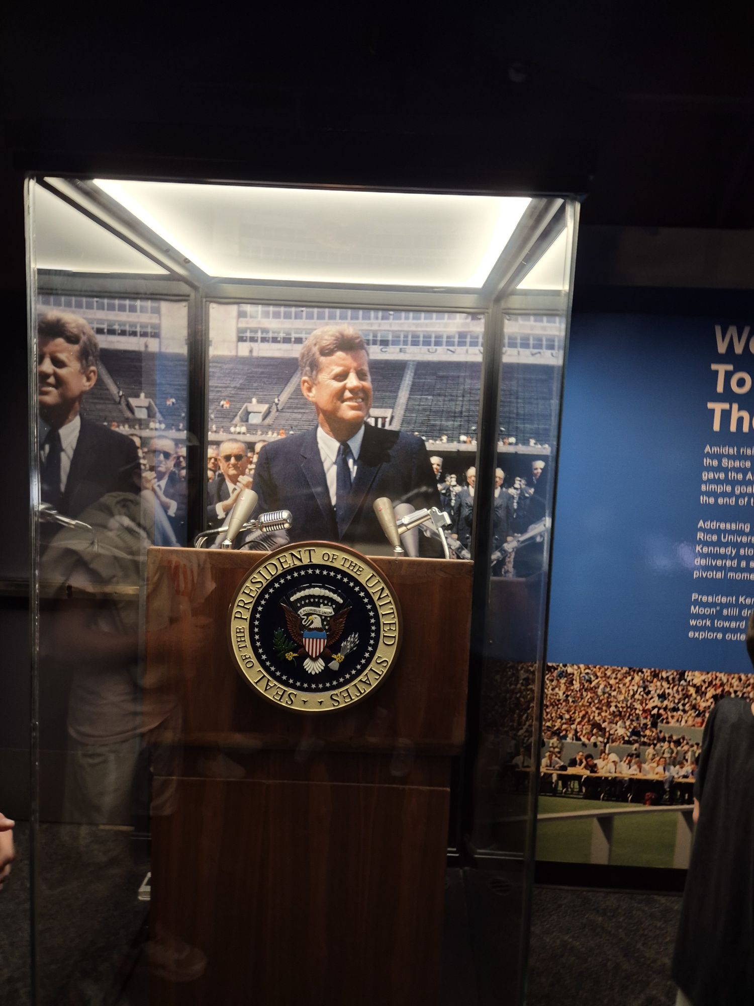 A témától függetlenül is olyan fantasztikusan ötletes, egyszerű és nagyszerű megoldásokkal mint az alábbi, ahol Kennedy és a háttér egy színes, az elnök valódi méretére nagyított fotó, elé pedig berakták az eredeti fotón szintén megörökített pulpitust replikáját mikrofonokkal, mindennel, a fotóról pedig kiretusálták azt.