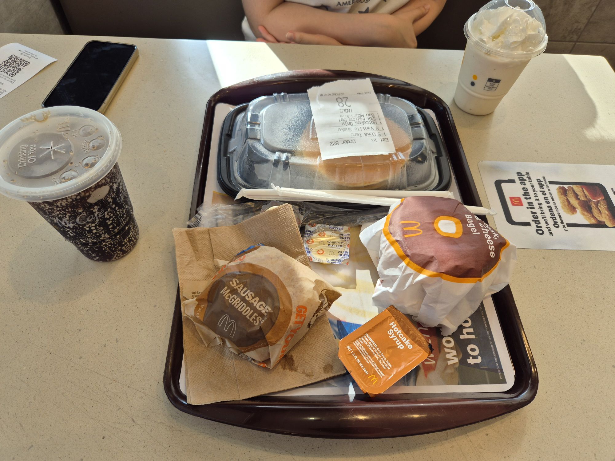 Bent pedig – skandallum! – nem lehetett a klasszikus burgerek egyikét sem megvásárolni, pedig ha már ide kerültünk kipróbáltam volna, hogy ugyanolyan-e az íz (nyilván az). Lehetett viszont grillkolbászos (húspogácsa formátumban)-tojásos szendvicset, palacsintát (kb 4-szer akkora mint az otthon a Burger Kingben adott kis korongok) és bagelbe rakott sajtos marhahúsos szenyát rendelni. Üditőkből (sőt, úgy mindenből) megszoktuk máris, hogy a legkisebbet kell rendelni, mert az is nagyon sok lesz. Így festett: